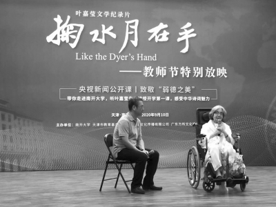 九月十日教師節(jié),南開大學舉辦《掬水月在手》影片首映式。葉嘉瑩先生是國際儒聯(lián)榮譽顧問,我銜命陪同王念寧副會長專程赴南開致賀,有幸在南開禮堂聆聽九十六歲高齡的迦陵先生與白巖松共話詩意人生。迦陵先生坐在輪椅上娓娓道來,鬢發(fā)皤然,聲如洪鐘,風華絕代。