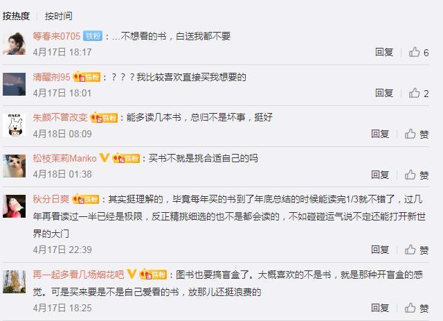 此前,部分網(wǎng)友在中新經(jīng)緯微博評論對“圖書盲盒”現(xiàn)象開展討論。有網(wǎng)友提到,“其實挺理解的,畢竟每年買的書到了年底總結(jié)的時候能讀完1/3就不錯了,過幾年再看讀過一半已經(jīng)是極限,反正精挑細(xì)選的也不是都會讀的,不如碰碰運氣說不定還能打開新世界的大門。”也有網(wǎng)友認(rèn)為,“不想看的書,白送我都不要”“買書不就是挑合適自己的嗎”等等。