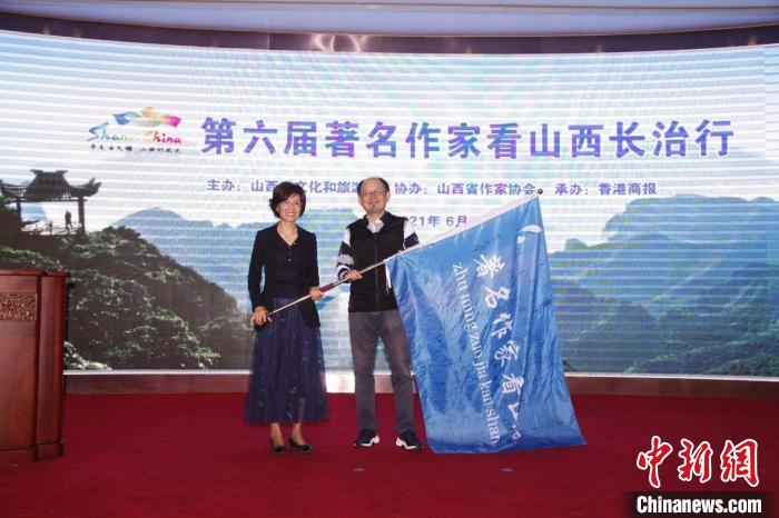 山西省文化和旅游廳廳長(zhǎng)王愛(ài)琴向“第六屆著名作家看山西”采風(fēng)團(tuán)授旗?!×浩G鋒 攝