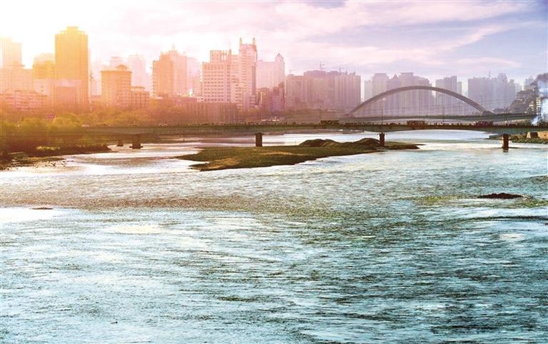 河分南北,勢(shì)接?xùn)|西。舒寧陜之博帶廣袖,帶青藏之峨冠雪衣。山逶迤而續(xù)祁連,水澎湃而瀉右?guī)?。匯洮湟之迤邐,有容乃大;與華夏之康莊,唇齒相依??睾游髯呃?,自古而始;俯渭涇秦川,由朝至夕。綴葫蘆狀岸渚坪灘,幾多古渡;依膏腴處坡谷盆地,即就蕃息。筑虹蜺經(jīng)百年,鐵橋第一;盤游龍於今朝,立交數(shù)十。去病鞭地,五泉山勝于秀逸;永誠(chéng)建院,白塔寺高于云齊。指點(diǎn)九州,大禹登九州之臺(tái);漂流黃河,洋人恐招手之磯。草覆馬銜而能牧,林茂興隆云可棲。繞營(yíng)盤高嶺排五,峙雄關(guān)沿河有七。留千古名,白馬浪細(xì)聽湍流不息;鎖萬代鑰,金城關(guān)只留站牌不奇。雷壇留碑,金天觀曾殿宇壯麗;華林無寺,節(jié)能燈照幽路石基。湍流黃河,九曲回腸依然東去;水轉(zhuǎn)輪盤,十方高地亦滿紛披。