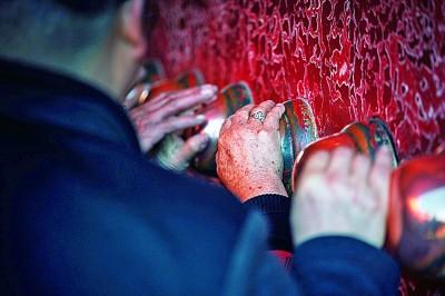 游客們撫摸著午門正門的門釘,走進(jìn)故宮參觀。