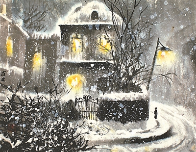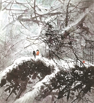 馮先生還和夫人在每年結(jié)婚紀(jì)念日時(shí)一起作畫,“我們?nèi)ツ赀^了綠寶石婚,結(jié)婚55周年。每到結(jié)婚紀(jì)念日,都是我們倆人畫一幅,畫一對(duì)小鳥。早在六七十年代最艱苦的時(shí)候就開始了,因?yàn)槲曳蛉艘彩钱嫯嫷?,我們那時(shí)一起畫了一對(duì)小鳥在風(fēng)雪里,那幅畫我現(xiàn)在還有。后來我們一直畫鳥,風(fēng)景在不斷地變化,這和我們對(duì)生活的感受有很大的關(guān)系。”