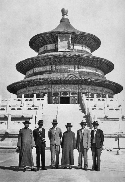 1935年5月9日,天壇圜丘壇開工,朱啟鈐、梁思成、劉敦楨、林徽因等古建專家,作為工程的技術顧問,楊廷寶則以基泰工程司總建筑師的身份指導工程實施的全過程。圖為祈年殿修繕完工紀念照。資料圖片