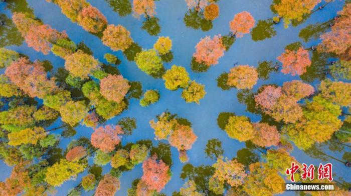 資料圖:初冬季節(jié),湖北武漢新洲區(qū)漲渡湖濕地?cái)?shù)千棵水杉葉紅似火、五彩斑斕,美景如畫。中新社發(fā) 趙廣亮 攝