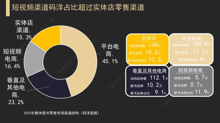 另外,2022年零售圖書市場中,短視頻電商碼洋占比趕超實體店渠道零售占比。目前短視頻電商作為新興電商,聚集越來越多的用戶注意力。