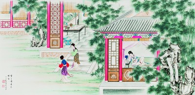 寶玉順腳一徑來(lái)到瀟湘館,信步走入,只見鳳尾森森,龍吟細(xì)細(xì),悄無(wú)人聲。走至窗前,一縷幽香從碧紗窗中暗暗透出。寶玉便將臉貼在紗窗上,往里看時(shí),耳內(nèi)忽聽得細(xì)細(xì)的長(zhǎng)嘆了一聲道:“每日家情思睡昏昏。”譚鳳嬛繪