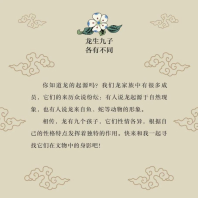 媽媽告訴如意,這是一個“時光寶盒”,里面有來自故宮不同領域的10位專家從故宮館藏中精選的262件“龍”文物,它們每天登場介紹自己的故事,還會請小讀者幫忙,每日動手給日歷中的小龍如意卷軸貼出一身漂亮的龍鱗。