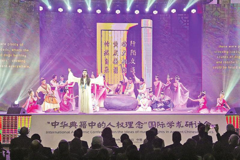 11月20日,由中國人權研究會、湖南省委宣傳部、湖南大學主辦的“中華典籍中的人權理念”國際學術研討會在湖南大學岳麓書院開幕。來自中國、美國、加拿大、意大利、印度、巴基斯坦、日本等國家的200余名專家學者與聯(lián)合國國際機構代表,以及國內(nèi)有關部門、社會組織代表參會研討。圖為演員在“中華典籍中的人權理念”國際學術研討會開幕式暨主論壇現(xiàn)場表演。