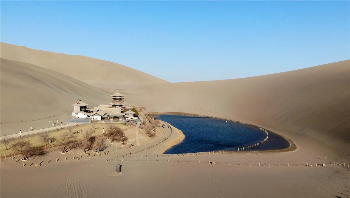 3月17日拍攝的甘肅省敦煌市鳴沙山月牙泉景區(qū)(無人機(jī)照片)。張曉亮攝