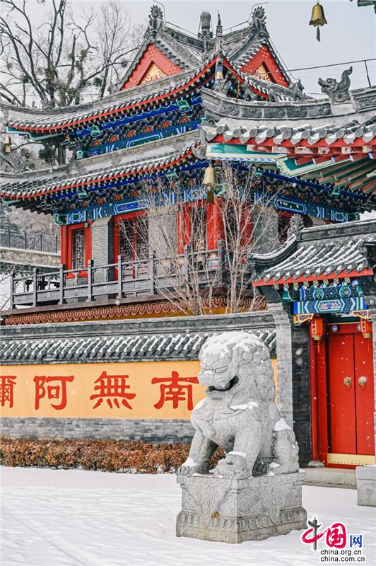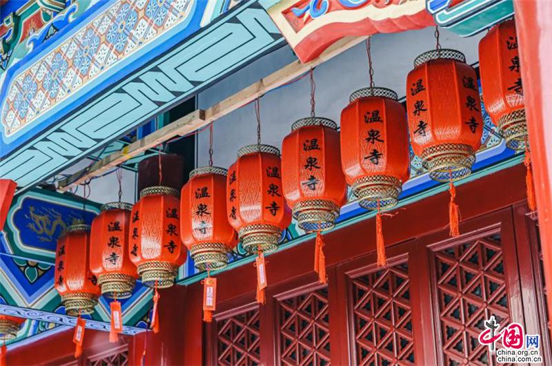 聽(tīng)說(shuō)這座寺廟的歷史可以追溯到400多年前,門(mén)前的石獅子十分莊嚴(yán),傳遞著佛門(mén)圣地的意境。腳踩在雪地上,發(fā)出“嘎吱嘎吱”的聲音;進(jìn)入了廟內(nèi),就能看見(jiàn)白雪覆蓋的木質(zhì)小橋;還有廟宇內(nèi)回廊上精致的鏤空鉤花和印著“溫泉寺”字樣的燈籠。