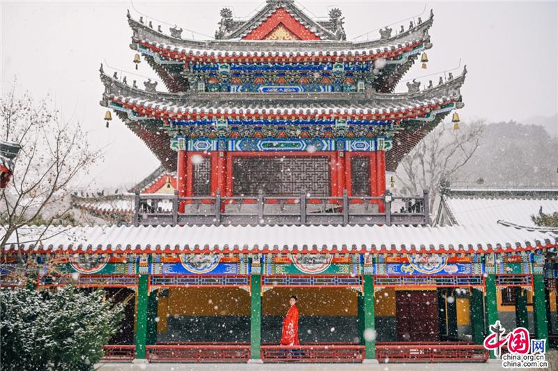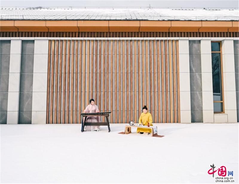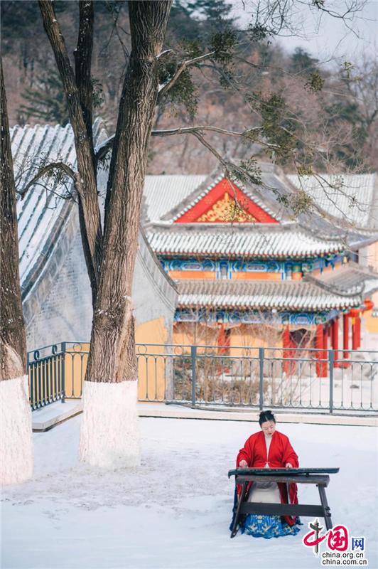 寺廟高處,古榕旁、雪地上,還有另一位古風(fēng)裝束之人在彈奏古箏,聲意蕭瑟。伴隨空靈的山河意境,飄至遠(yuǎn)方。冬季最美的畫(huà)面,也不過(guò)如此。