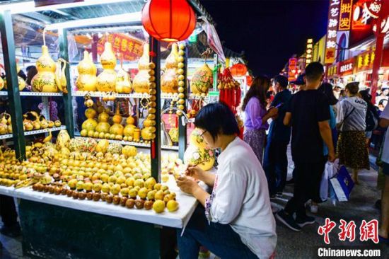 7月29日,游客在敦煌旅游工藝品一條街上漫步,體驗濃郁的民俗風情和敦煌文化?!⊥醣筱y 攝