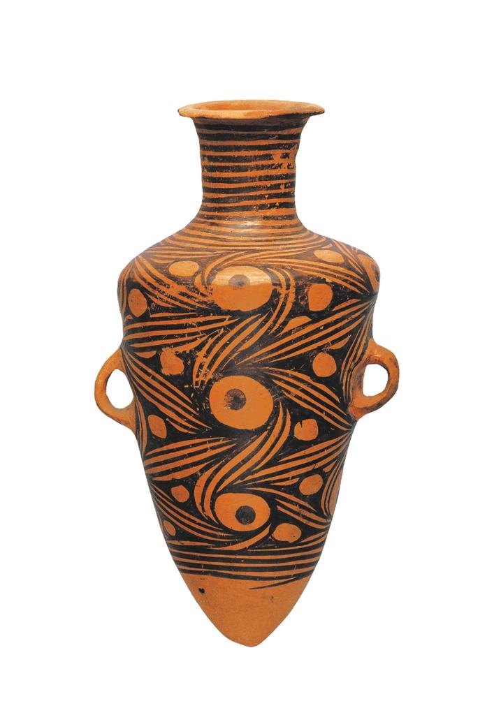 馬家窯文化馬家窯類型(距今約4800年),1971年隴西縣首陽(yáng)公社呂家坪出土。這只彩陶瓶最亮眼的特點(diǎn)當(dāng)屬瓶身上三組旋渦紋了,這三組用黑彩繪就的連續(xù)旋渦紋與瓶頸的平行弦紋聯(lián)系,圖案華美勻稱,連綿不斷卻疏密有致,真難想象,近5000年前的古人繪畫技藝竟如此精湛!這只彩陶瓶另有一個(gè)奇特處同學(xué)們發(fā)現(xiàn)了嗎?此瓶的瓶底為什么是尖的,尖底可怎么置放?想必是用繩子系著瓶的兩耳懸掛著用的。