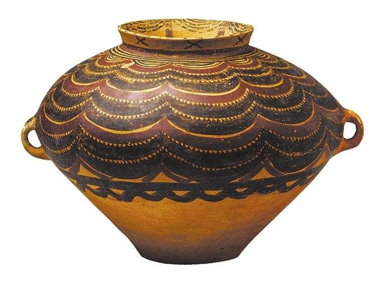 馬家窯文化半山類型(距今約 4500 年),廣河縣地巴坪出土。這是雙耳甕器型大氣貴重,施以紅、黑二彩,紅、黑彩交替使用,腹部繪多層連續(xù)垂弧紋和鋸齒紋,黑、紅彩交替使用,由三組分層連續(xù)的垂弧紋組成整體圖案,每層由兩層黑色帶紋和一層紅色帶紋組成,黑色帶紋上緣繪向上的鋸齒紋。整個(gè)圖案密集繁復(fù),俯視猶如一朵盛開的鮮花,造型豐滿,色彩鮮艷。