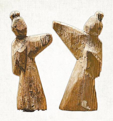 武威磨嘴子漢墓出土,現(xiàn)藏甘肅省博物館的兩件彩繪木舞蹈俑,其中一件寬4.9厘米,厚3.5厘米,高26.7厘米。木俑梳高髻,著長袍,身體向右傾斜,左臂置于胸前,右臂舉起,頭微側(cè),作舞蹈狀。另一件木俑底寬5.4厘米,高14.5厘米,削制而成。以黑、紅兩色繪五官和衣領(lǐng)等。木俑挽高髻,穿袍服。左臂撫胸,右臂向前上舉起,身子傾斜,作舞蹈狀。它們和同一地點(diǎn)出土的漆樽舞蹈畫一樣,都是現(xiàn)實(shí)生活中官僚貴族富戶舞伎的藝術(shù)再現(xiàn)。