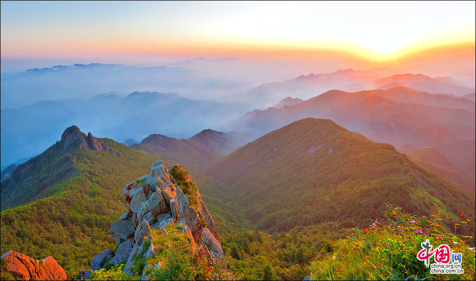 當(dāng)北京的第一縷陽光從這里升起。站在海拔2118米的頂峰平臺上,遙望東方,天際中開始露出幾抹灰色的浮云,隨后不斷地升騰、擴(kuò)大,繼而天邊漸紅,紅色越來越深,范圍越來越大,曙光漸露,丹霞輝映,把整個東方都變成濃濃的紅色。山峰在云霧中時隱時現(xiàn),彩云在天際間變幻,有時像奔馳的駿馬,有時像仙女飄逸,有時像玉樹瓊宮……千姿百態(tài),遐想無窮。猛然,比紅色的彩云更火紅、更光亮、更鮮艷的太陽露出了一條邊弧,緩緩上升。四周的云霧似乎忍受不了她那光茫的照射而淡化、隱退,太陽則很快掙脫了云霧與夜色的纏繞,迅速地上升,躍出天邊。霎時,一輪紅日噴薄而出,金光四射,霞光瑞氣,照徹天宇,山巒、萬樹沐浴著朝陽的金輝,令人眼花繚亂。舉目四望,朝霞映照下的霧靈山,群峰起伏,云霧如海,波濤洶涌,九曲十八彎的旅游公路似戲水游龍,在峰巒間若隱若現(xiàn)。