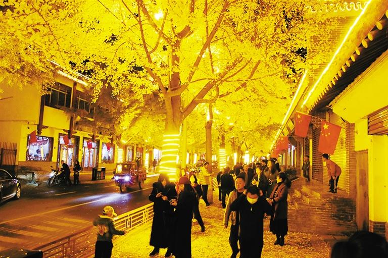 立冬前后,被稱為“黃金大道”的天水市青年南北路銀杏一條街,黃葉飛舞一地金黃,迎來一年中最佳觀賞期。 天水市秦州區(qū)青年南北路全長(zhǎng)700余米,道路兩側(cè)種滿了銀杏樹。落葉季節(jié),每到夜幕降臨后,銀杏樹上的LED金黃色燈帶亮燈后,整條街黃葉黃燈交相輝映,璀璨奪目,成了市民近日遛彎首選的“打卡”地。