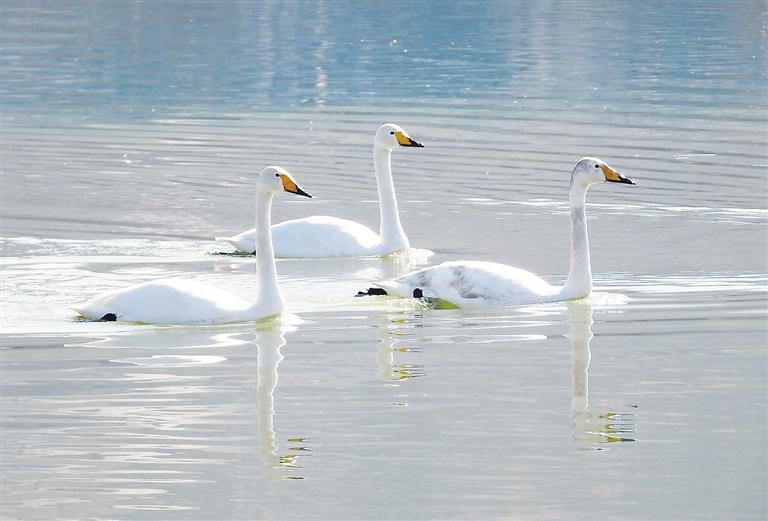 近日,永靖縣鹽鍋峽鎮(zhèn)境內(nèi)的黃河八盤峽水庫(kù)成為天鵝等候鳥越冬的樂(lè)園,它們?cè)诖藯?、覓食,成為冬日黃河里的一道靚麗風(fēng)景。 本報(bào)記者 史有東 攝