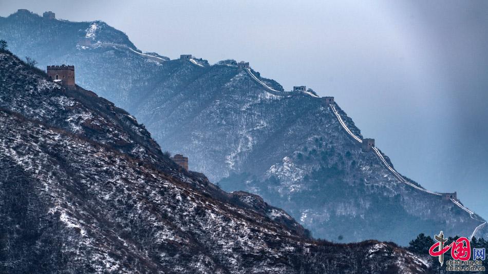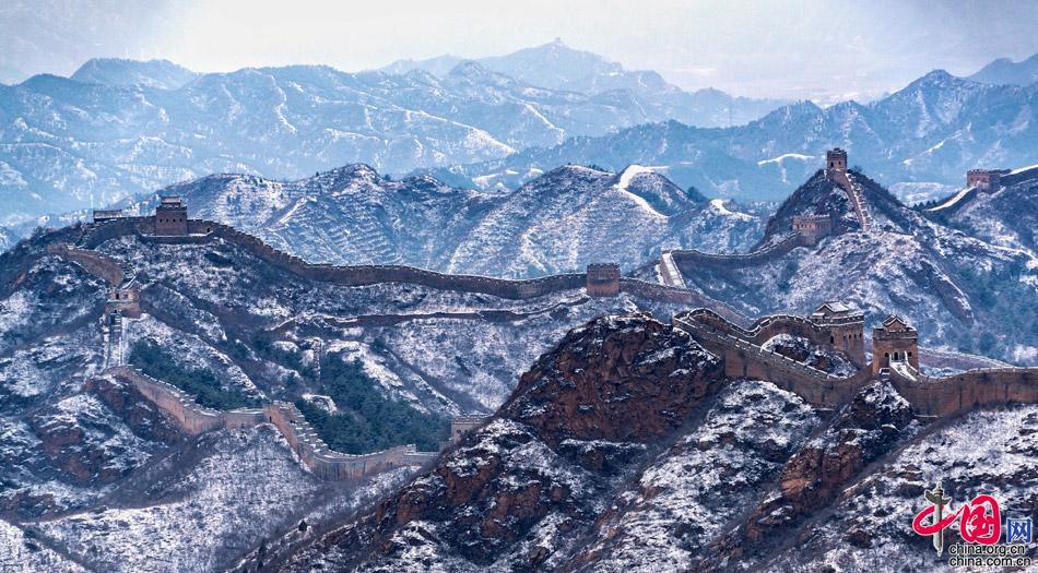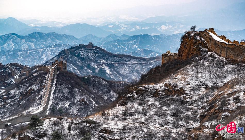 在春雪覆蓋下,山巒起伏,壯觀的長城在崇山峻嶺之巔如巨龍飛舞,一幅雪墨丹青,令人向往。
