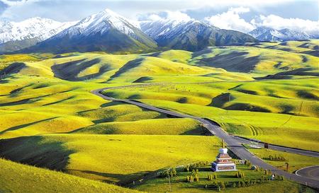 沿著國(guó)道227行走,放眼望去,遠(yuǎn)處祁連山脈高峰聳立,近處起伏的山丘高低錯(cuò)落,山間綠草如茵,色彩斑斕的野花星星點(diǎn)點(diǎn)播撒在綠草之中。山坡上點(diǎn)綴的牛羊安靜地吃草,呈現(xiàn)出一派安靜祥和的田野風(fēng)光。最耀眼的當(dāng)屬這里的油菜花,處處可見(jiàn)金黃一片,成為七月河西走廊一道亮麗的風(fēng)景。