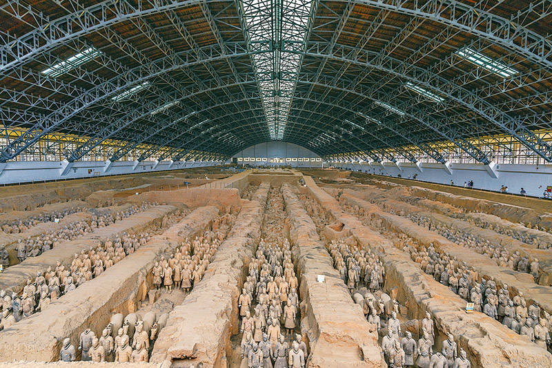 秦始皇陵是中國歷史上第一個多民族的中央集權國家的皇帝秦始皇于公元前246年至公元前208年營建的。作為秦始皇陵陪葬墓坑之一的兵馬俑坑于1974年被發(fā)現,被譽為“世界第八大奇跡”。圖為秦始皇兵馬俑博物館一號坑全景。 人民圖片 丁俊豪/攝