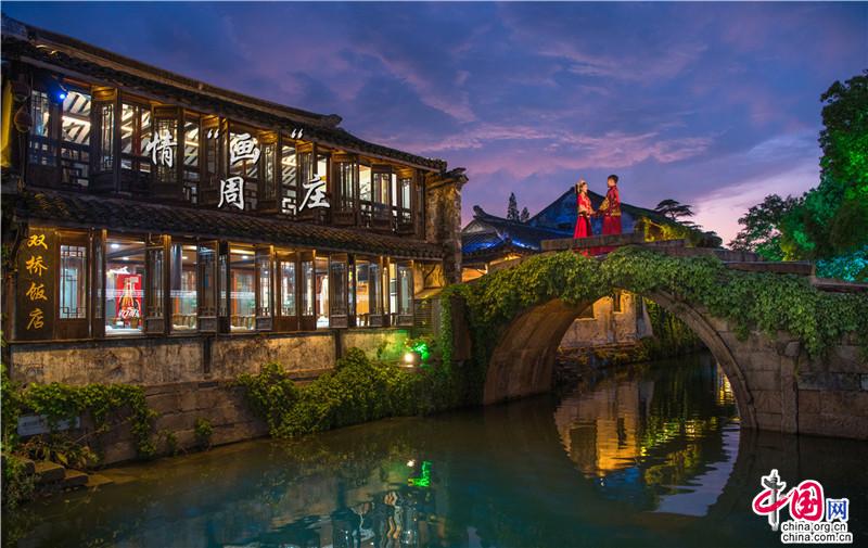 雙橋如畫,入畫周莊。牛郎織女七夕鵲橋相會,而我與你邂逅在江南水鄉(xiāng)。人間煙火至,攜手水鄉(xiāng)游,夜色下隱隱約約的古橋,仿佛是叩響幸福之門的鑰匙,溫柔靜默,流淌著時光,好似走過,便可白頭偕老。