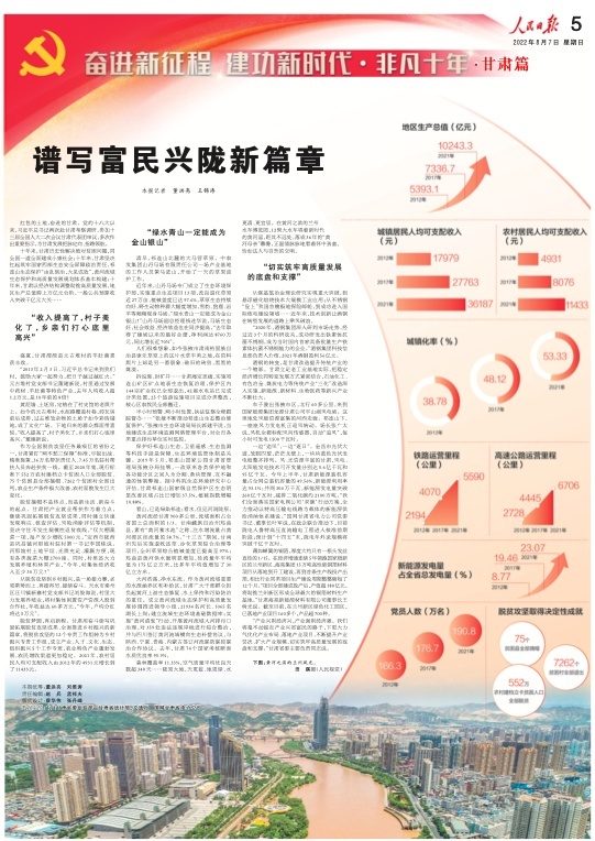8月7日,人民日報刊發(fā)“奮進新征程 建功新時代·非凡十年”甘肅篇,重磅推出兩塊整版,聚焦黨的十八大以來,隴原兒女牢記習近平總書記的殷切囑托,踔厲奮發(fā)、銳意進取,埋頭苦干、勇毅前行,加快建設幸福美好新甘肅,不斷開創(chuàng)富民興隴新局面。