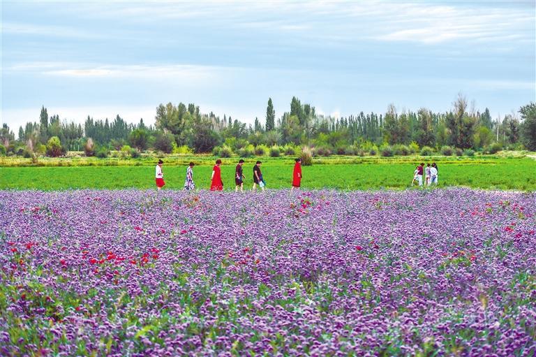 8月7日,游人在敦煌月牙泉鎮(zhèn)百畝花田游覽。 新甘肅·甘肅日?qǐng)?bào)通訊員 王斌銀