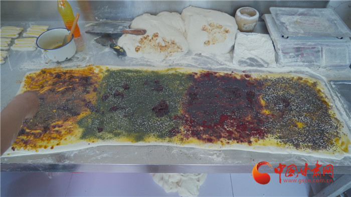 記者走進(jìn)榆中縣金崖鎮(zhèn)浩燕饅頭店,一股濃濃的胡麻油、玫瑰醬、香豆等混合的香氣撲面而來(lái),李浩燕正在忙碌地趕制一批榆中傳統(tǒng)手工月餅。案板上除了發(fā)好的面團(tuán),還擺上了炒胡麻碎、姜黃、白砂糖等豐富的佐料。只見(jiàn)李浩燕從揉面開(kāi)始,然后鋪餡、搟制、卷面、切分、披花,一道道工序一氣呵成。經(jīng)過(guò)一個(gè)多小時(shí),新鮮美味的月餅出爐了,切開(kāi)后,內(nèi)里豐富,色彩斑斕,咬上一口軟糯可口,回味留香。