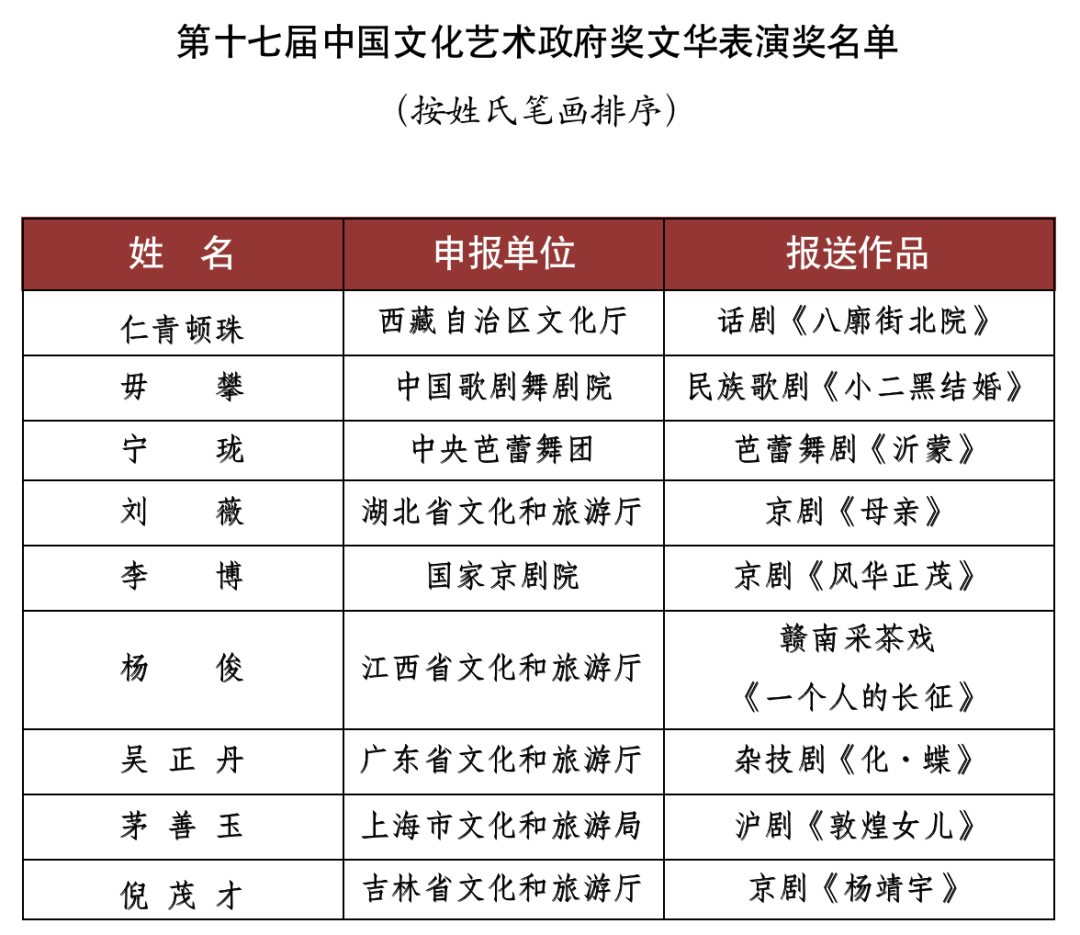 9月15日,文化和旅游部對(duì)外公布了《第十七屆文華獎(jiǎng)獲獎(jiǎng)名單》。舞劇《五星出東方》(北京市文化和旅游局選送)、話劇《塞罕長(zhǎng)歌》(河北省文化和旅游廳選送)、舞蹈詩(shī)劇《只此青綠》--舞繪《千里江山圖》(中國(guó)東方演藝集團(tuán)有限公司選送)等15個(gè)作品獲得第十七屆中國(guó)文化藝術(shù)政府獎(jiǎng)文華大獎(jiǎng)。