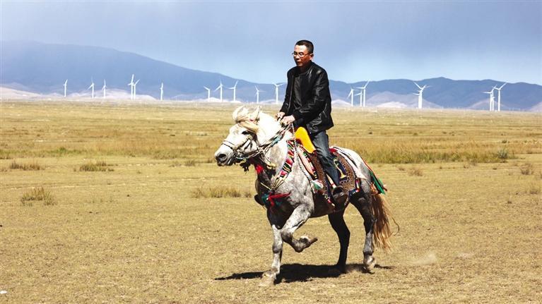 驅(qū)車向草原腹地進發(fā),遠遠就能看見有人在馴馬。馴馬者房利軍和他的坐騎“尕青”仿佛“人馬合一”,同呼吸、共步調(diào),一遍遍練習,像走,更像飛。這便是傳說中的走馬文化,和跑馬的加速度不同,走馬不管是走還是跑,都是快步勻速,短途速度快,長途耐力強,騎乘平穩(wěn),姿態(tài)優(yōu)美,觀賞性強。在牧區(qū),走馬實用性強,深受當?shù)厝藲g迎。曾有專家稱,“馬踏飛燕”的“馬”即為走馬。每天,和武威天祝一山之隔的這片草原,都與房利軍有關(guān),在這里,他專心馴馬,而他的500只羊則在一旁撒歡。尤其從高空俯瞰,草原牧羊的畫面甚是壯觀。看完馴馬,房利軍騎馬帶路,采訪車沿著馬道回到了“家”。