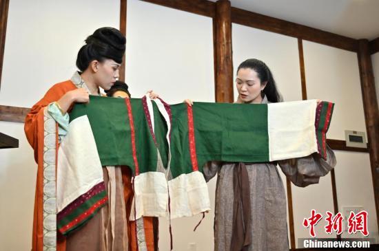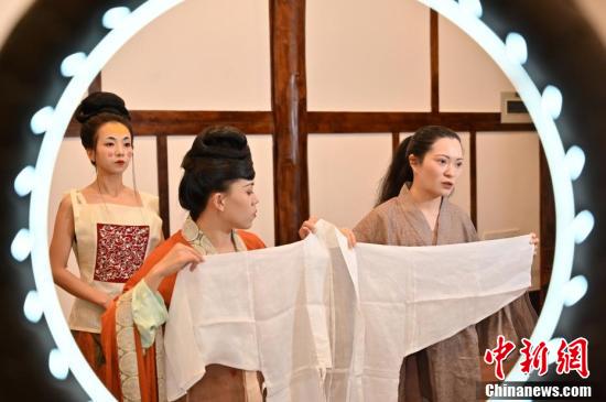 蔣雨林介紹其手工復(fù)原制作的漢服飾。