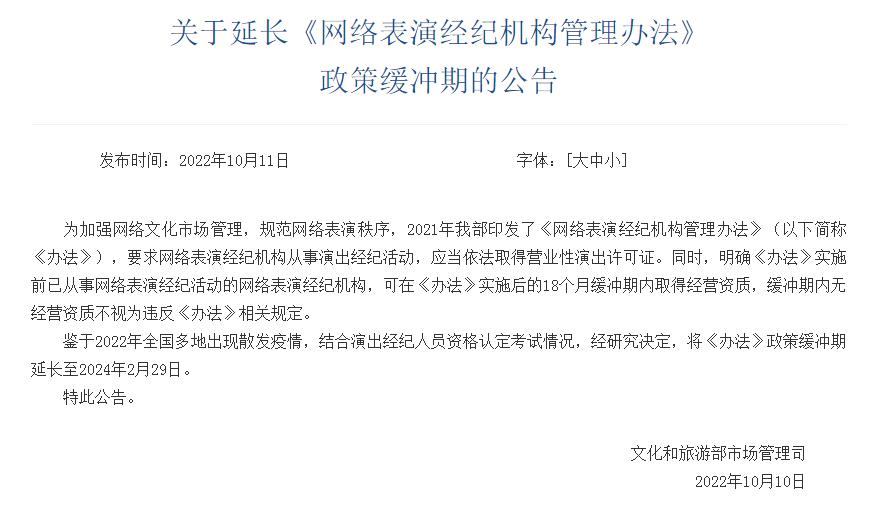 文旅部:延長《網(wǎng)絡表演經紀機構管理辦法》政策緩沖期