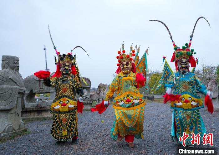 郎溪縣國家級非遺跳舞猖在郎溪縣濤城鎮(zhèn)慶豐村大佛山養(yǎng)心谷展演。 李曉紅 攝