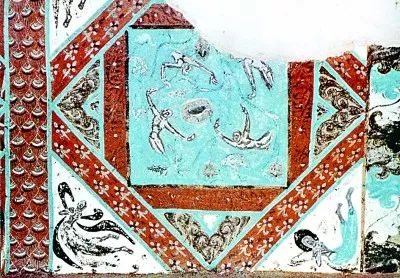 在莫高窟420窟中,還有一幅展現(xiàn)隋代游泳活動的畫面。圖中兩位游泳者正在模仿爬行的動作,呈兩腿交替打水、兩臂輪流劃水狀,頭部均轉向一側吸氣,類似現(xiàn)在自由泳中的基本動作和吸氣方式。