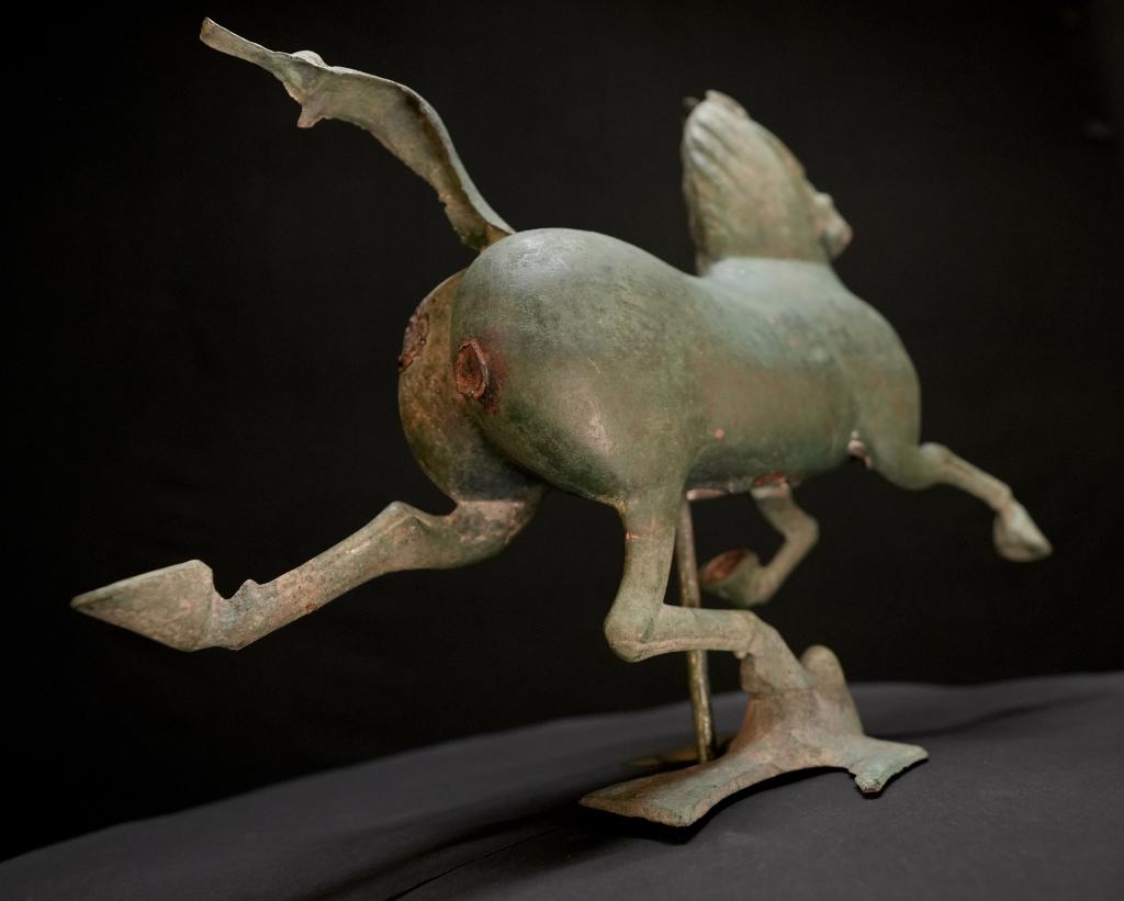 馬兒如在空中飛馳,一足踏上飛鳥的剎那,飛鳥回首驚顧。細細觀之,馬的口、眼、鼻均張開,鬃毛和尾絲后揚,令人仿若聽見馬兒奔騰的嘶鳴和風(fēng)嘯聲,靜態(tài)的青銅器充滿靈動之感。