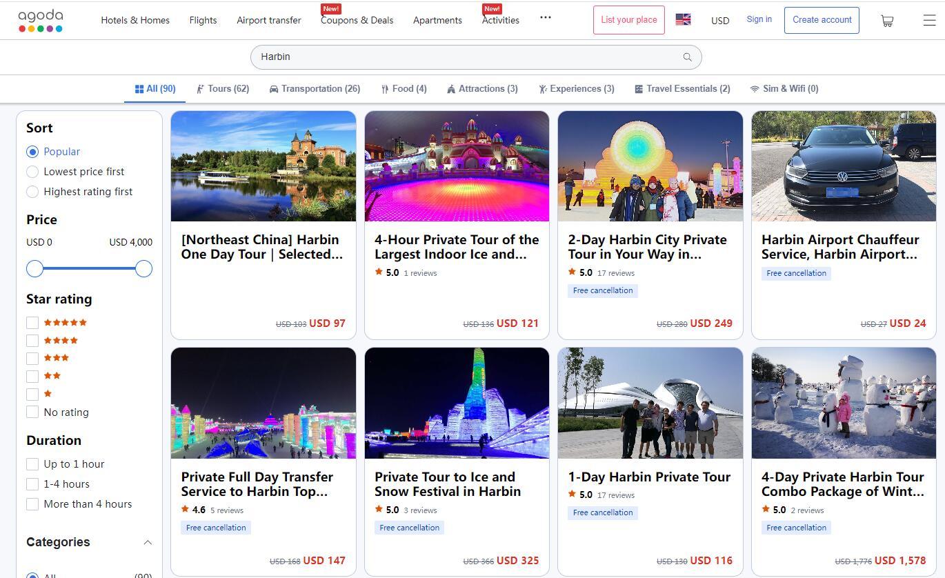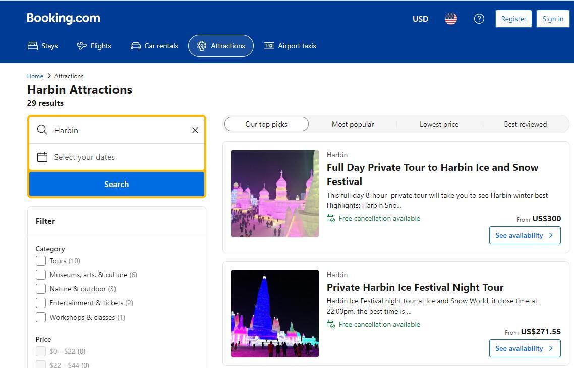 在酒店及住宿在線預(yù)訂平臺(tái)Booking.com上,可以搜索到近30個(gè)關(guān)于哈爾濱旅游的服務(wù)。其中,“哈爾濱冰雪節(jié)全日私人旅游”包括私人汽車和導(dǎo)游費(fèi)用,不包括門票收費(fèi)300美元,包括門票則收費(fèi)480美元。“哈爾濱冰雪節(jié)私人夜游”包括私人汽車、私人旅游、酒店接送、門票,收費(fèi)271.55美元起。