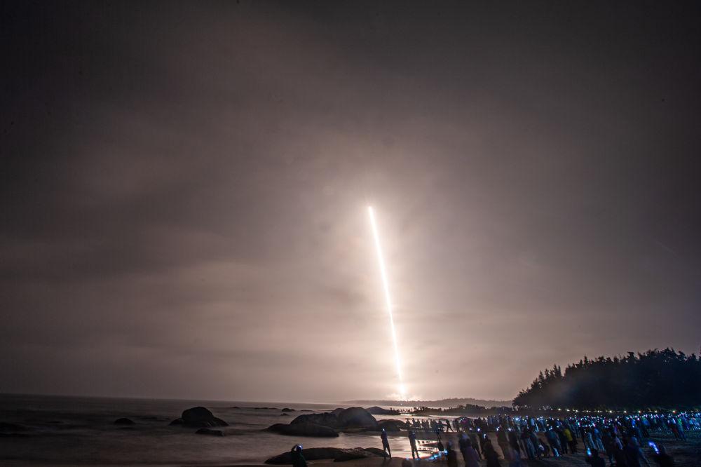↑長征七號改遙二運(yùn)載火箭在海南文昌航天發(fā)射場發(fā)射,吸引眾多居民和游客在海邊觀看。新華社記者 蒲曉旭 攝