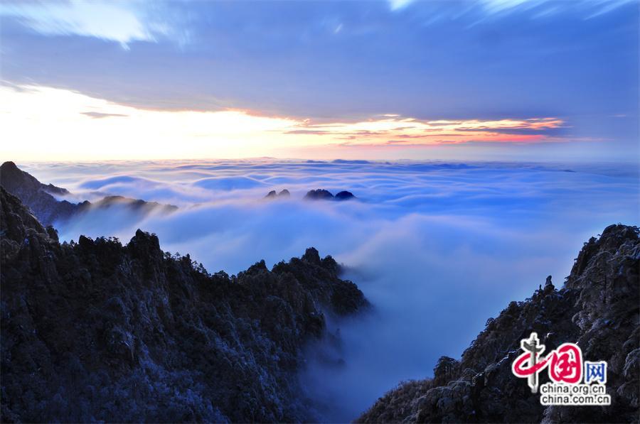 原標(biāo)題:只有一個(gè)黃山:雪后云海日出朝霞描繪絢麗畫(huà)卷