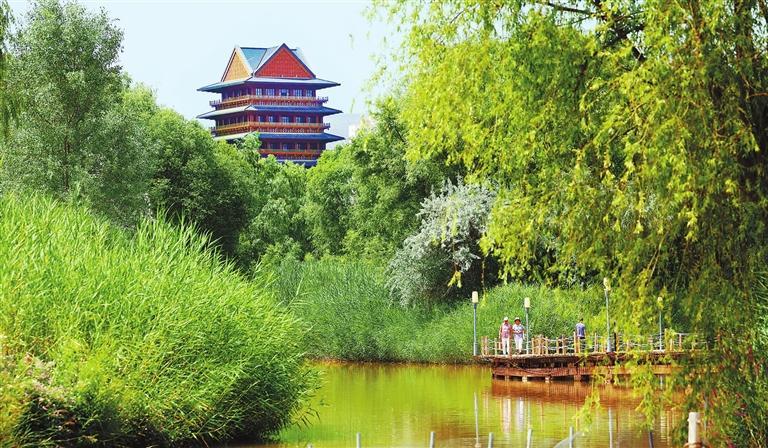 隨著黃河水位的變動,濕地四季景色各異。亭臺樓閣、小橋流水,漫步其間讓市民和游客領略到黃河濕地的獨特風貌。