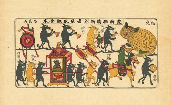 忠良美作坊收藏的清代古版復刻年畫《老鼠娶親》,該年畫采用古法天然顏料純手工印制,色彩斑斕,古味濃郁