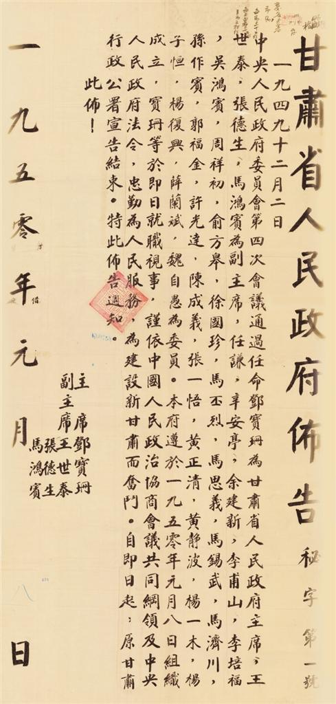 1950年1月,甘肅省人民政府頒發(fā)的第一號(hào)布告。
