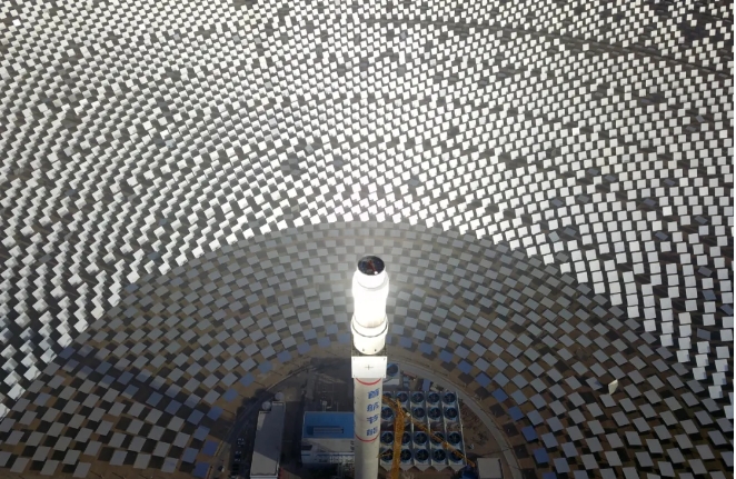 人們驚呼,這是自然力與人類智慧的完美創(chuàng)造:戈壁荒灘上“種”出了人造太陽(yáng)。這個(gè)100兆瓦熔鹽塔式光熱電站,占地面積相當(dāng)于780個(gè)足球場(chǎng),每年所生產(chǎn)的綠電可減排35萬(wàn)噸二氧化碳。