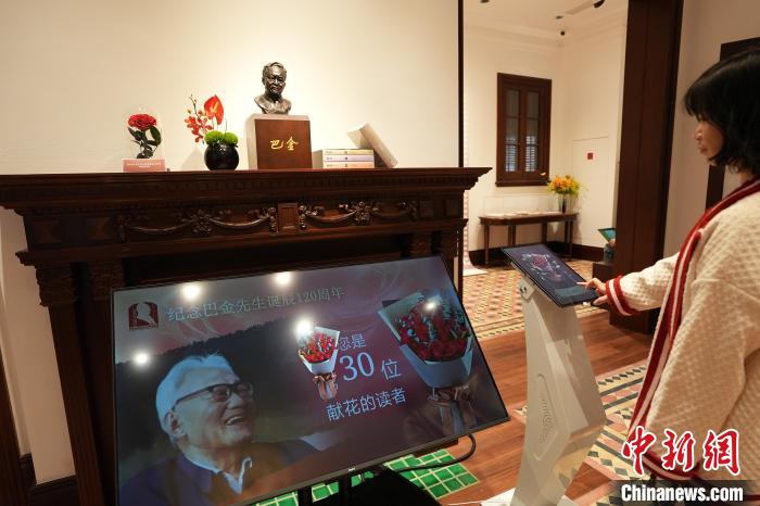 圖為觀眾為巴金送上“電子花”。中新社記者 張亨偉 攝