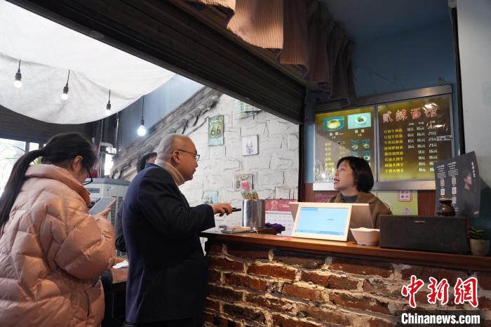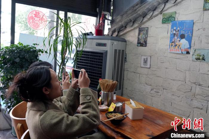12月31日,四川成都,影迷在面館拍照留念。中新社記者 安源 攝