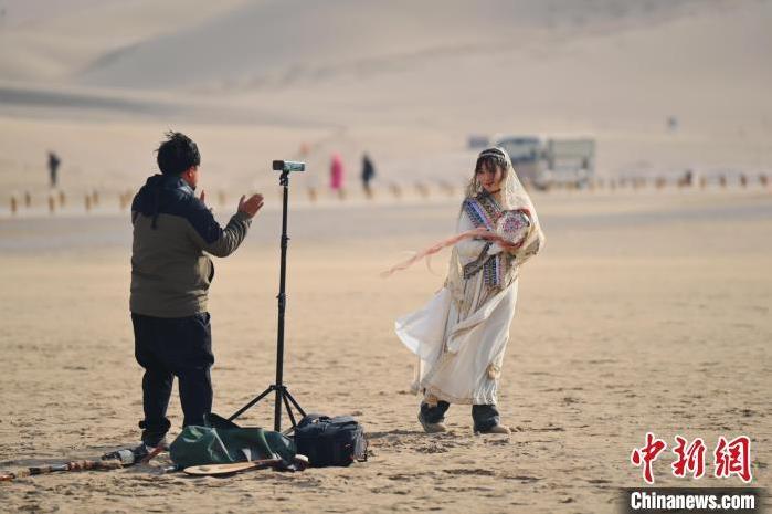1月13日,甘肅敦煌鳴沙山月牙泉景區(qū)內(nèi),游人進(jìn)行旅拍。中新社記者 李亞龍 攝
