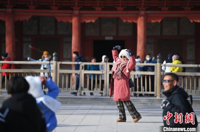 1月13日,甘肅敦煌莫高窟景區(qū)內(nèi),游人在莫高窟標(biāo)志性建筑九層樓前拍照打卡。中新社記者 李亞龍 攝