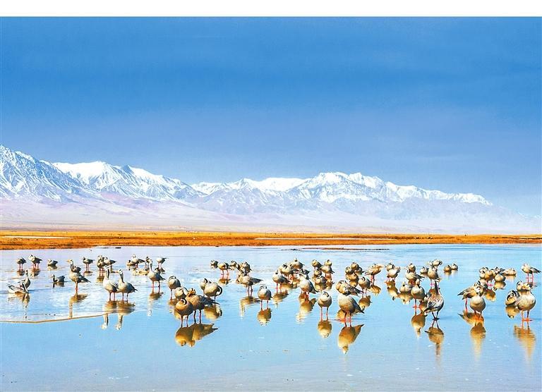 當(dāng)祁連山的雪線以肉眼難以察覺(jué)的速度后退時(shí),鹽池灣的冰封鏡面開(kāi)始出現(xiàn)裂紋。最先感知到這一變化的不是融水沖刷出的溝壑,而是斑頭雁黃色的喙。它們?cè)谌碌椎某炕杈€上劃過(guò),雙翅呼呼生風(fēng)。冰凌碎屑尚未與雁羽摩擦,便已發(fā)出細(xì)密的簌響,像是古琴開(kāi)弦前的調(diào)音。野馬南山與黨河南山兩山之間形成的盆地內(nèi)河流縱橫、湖泊密布,草甸、沼澤交錯(cuò),是斑頭雁和其他水鳥(niǎo)世代棲息繁衍的場(chǎng)所。盡管先頭部隊(duì)在3月下旬就已抵達(dá)這里,主力部隊(duì)卻要到4月上旬才會(huì)姍姍來(lái)遲。此時(shí)斑頭雁幼體已在越冬地充分發(fā)育,羽衣上幾乎看不到如苔蘚般斑駁生長(zhǎng)的新羽,只是頭部的兩條黑帶不如父母深邃,這是它們少經(jīng)風(fēng)霜的證明。它們降落在濕地灘涂時(shí),雝雝鳴雁,那聲音或許與兩千年前蘇武牧羊時(shí)在北海之畔聽(tīng)到的有些許相似。
