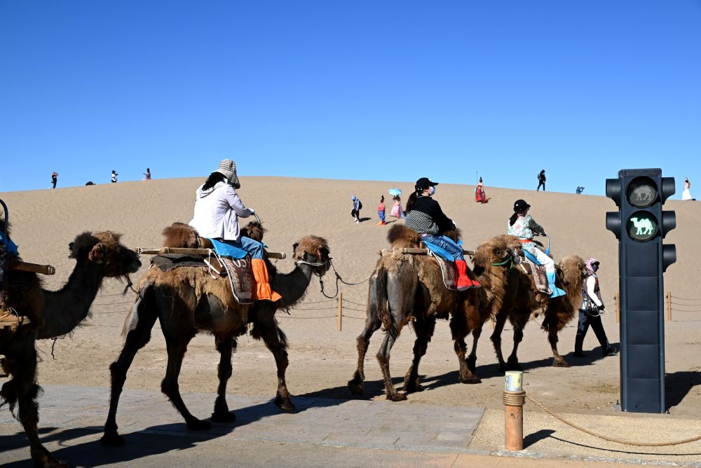 5月24日,敦煌市鳴沙山月牙泉景區(qū)的交通信號(hào)燈“綠駱駝燈”亮起時(shí),農(nóng)戶(hù)牽著駱駝?dòng)行蛲ㄟ^(guò)。敦煌市鳴沙山月牙泉景區(qū)設(shè)置具有駱駝元素的交通信號(hào)燈,保障了景區(qū)交通安全順暢。新華社發(fā)(張曉亮攝)