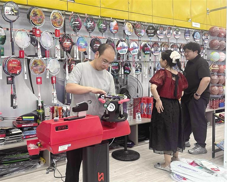 不僅如此,運動用品銷售也迎來小高峰。瑞德摩爾太平洋商場內(nèi)的健雄體育用品店內(nèi),老板正忙著給羽毛球空拍穿線。“我們不僅有現(xiàn)成的羽毛球拍,還可以根據(jù)客戶的需求給空拍穿線。”該店老板介紹,羽毛球拍網(wǎng)線價位30至100元不等,購線還可免手工費。羽毛球初學者一般都會買成品拍自己在家練習,而一些技術(shù)較好的顧客除了會選擇品質(zhì)較好的空拍,還會現(xiàn)場選線拉網(wǎng)定制屬于自己的球拍。“暑假以來,店內(nèi)羽毛球拍銷量大增,穿線需求也逐漸增多,周末從早忙到晚,每半小時穿一個球拍,最多一天穿24個,排隊等候已成常態(tài)。”此外,不少運動品牌也順勢推出促銷活動,吸引消費者選購。